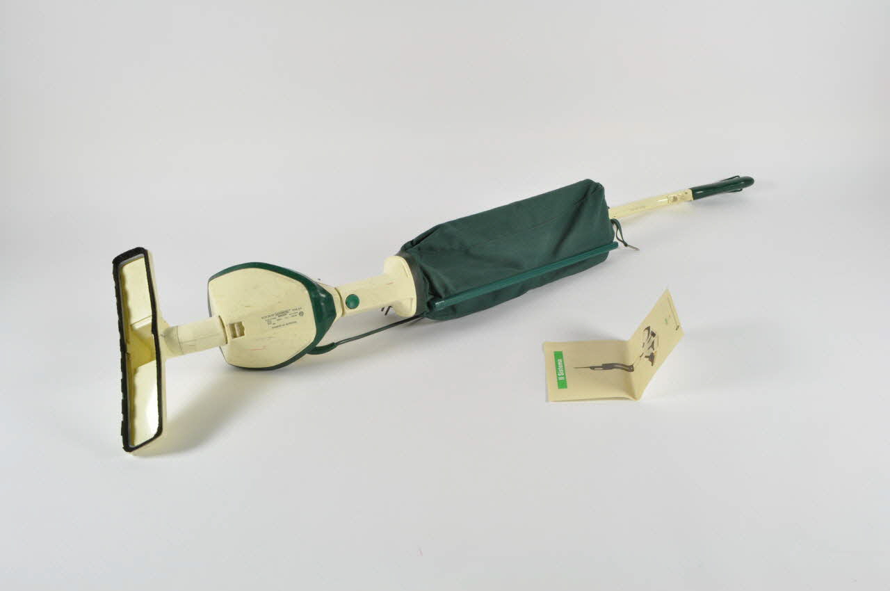 métal moulé, coloré; toile verte / .1 : Aspirateur balai, crème et vert, dont la plupart des pièces est démontable. Fil d'alimentation enroulable manuellement. Poche à poussière en toile de coton verte. Traces de poussière sur la brosse du balai.
