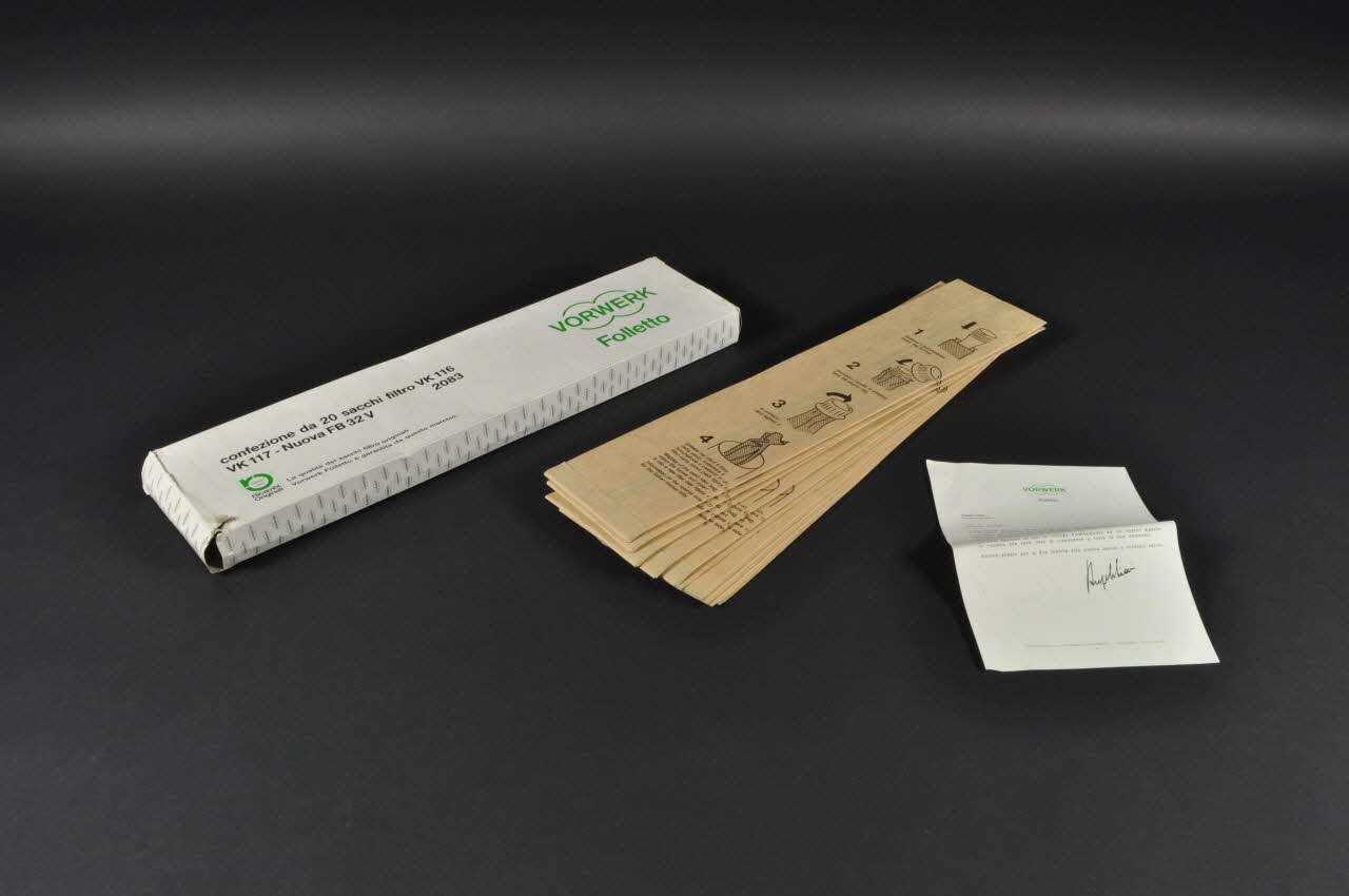 "MOD.VK 117 VORWERK electro TYPE 2H // IMPORTE D'ALLEMAGNE MADE IN GERMANY // 220 V 250 W // VORWERK+CO., WUPPERTAL" (Sur l'aspirateur.)"confezione da 20 sacchi filtro VK 116 // VK 117 - Nuova FB 32 V 2083 // Vorwerk Folletto // Ricambi Originali // La qualita dei sacchi filtro originali // Vorwerk Folletto e garantita da questo marchio." (Imprimée en noir et en vert.), boiteMatériaux et techniques