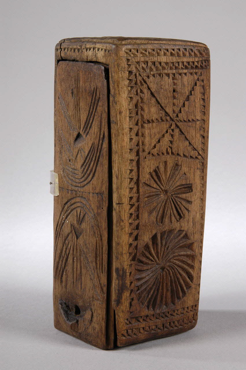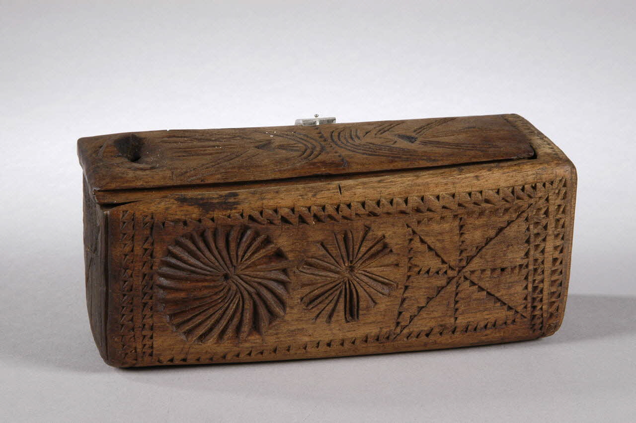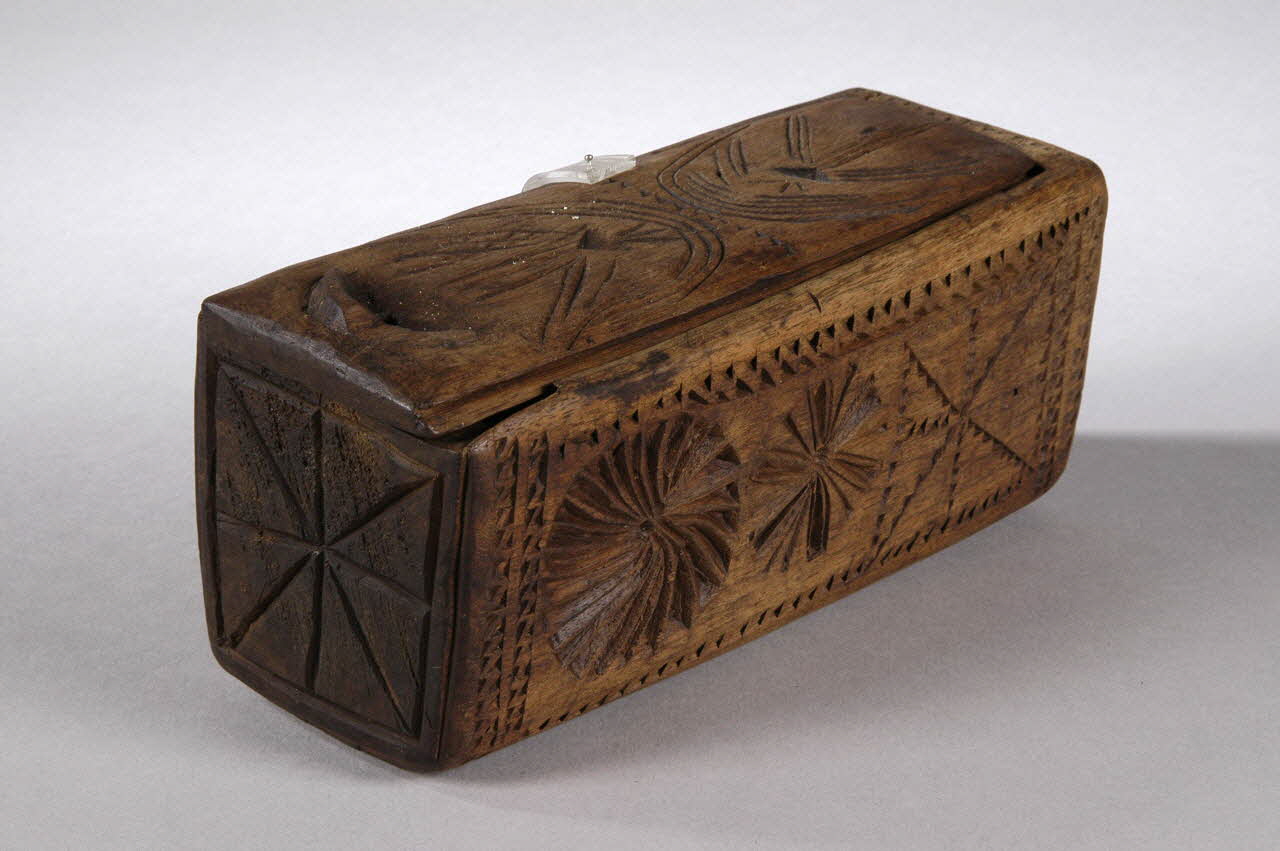 Bois taillé, évidé, décor gravé et ajouré, couvercle à glissière / Parallélépipédique, à entaille et ajour circulaire pour maintenir le couvercle fermé avec une cheville (disparue). Entre des bandes de dents de scie : rouelles, étoilés, filets, carrés.
