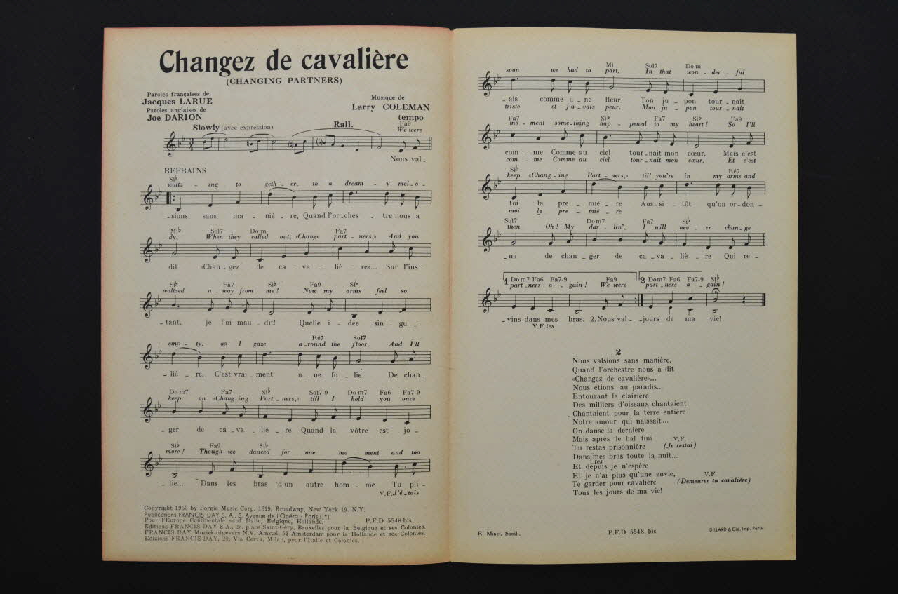 Sur la couverture, les portraits photographiques de Jean Bertola, Monette Auvray, Yves Furet et Camille Sauvage. Les inscriptions renseignent le titre de la chanson, le nom des auteurs, des artistes et de l'éditeur. A l'intérieur, partition et paroles de la chanson. Au dos, liste d'autres partitions publiées par l'éditeur.Matériaux et techniques