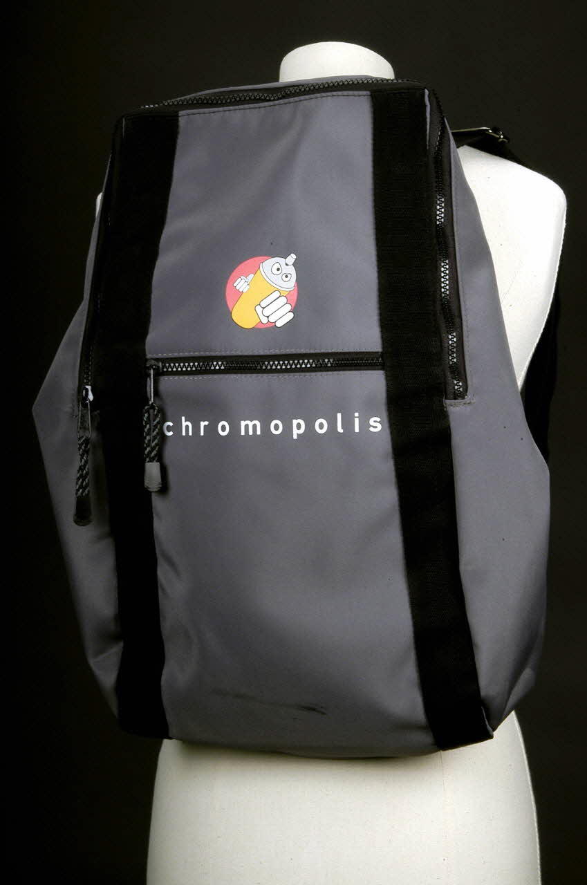 Sur son côté gauche, en bas, le sac possède une petite poche s'ouvrant grâce à une fermeture éclair verticale en plastique. Cette poche est décorée par un motif représentant une bombe de peinture orange à couvercle arrondi gris avec deux bras gris, des yeux et des gants blancs. Ce motif dépasse d'un fond constitué d'un cercle rouge. Sur la face principale, dans la partie haute, le sac s'ouvre à l'aide d'une fermeture en forme de U renversé laissant accès à l'intérieur du sac. Deux bandes de sangle en tissu synthétique noir sont cousues verticalement sur le devant du sac, et en dessous. Le sac possède une poche intérieur, au niveau du dos qui s'ouvre grâce à une petite fermeture éclair horizontale. Du côté placé contre le dos, le sac présente dans la partie supérieure une bande horizontale de sangle noire cousue maintenant une boucle de même matière pour suspendre le sac. Deux bretelles de sangle noire sont également cousues en dessous de cette sangle horizontale par le haut et maintenues à des triangles de tissu synthétique ajoutés en bas du sac, de chaque côté et complétées par un rectangle de métal argenté. Les bretelles sont réglables grâce à un rectangle de métal argenté avec une barre horizontale le séparant en deux interstices.Matériaux et techniques