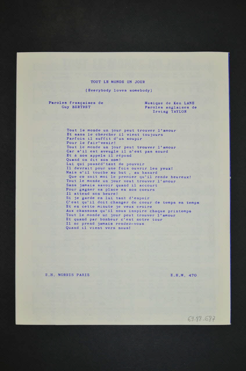 Les inscriptions renseignent le titre de la chanson, le nom des auteurs, de l'artiste et de l'éditeur. A l'intérieur, partitions et paroles de la chanson. Au dos, les paroles.Matériaux et techniques
