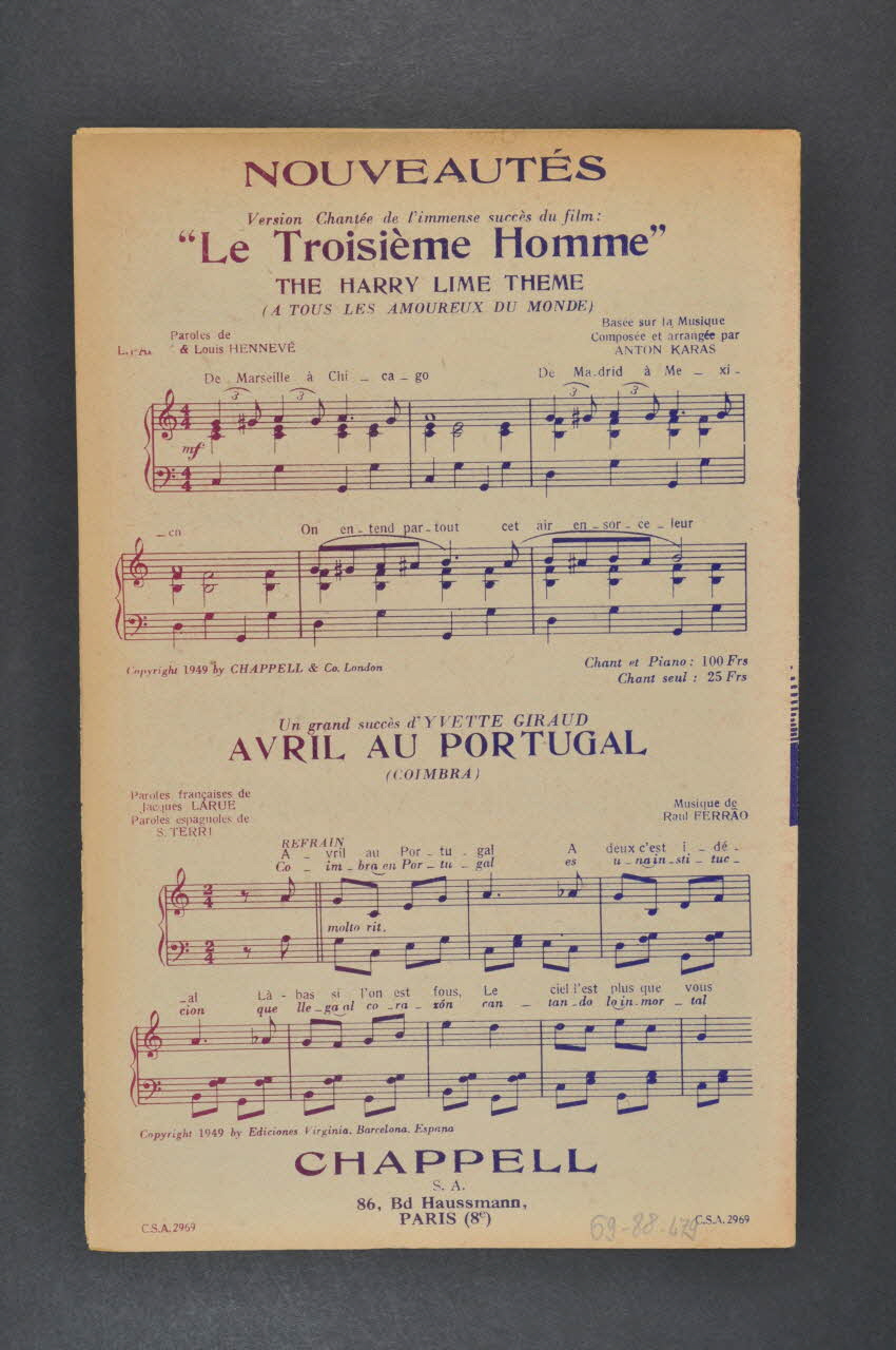 Les inscriptions renseignent le titre de la chanson, le nom des auteurs, de l'artiste et de l'éditeur. A l'intérieur, partitions et paroles de la chanson. Au dos, liste d?autres partitions publiées par l?éditeur.Matériaux et techniques