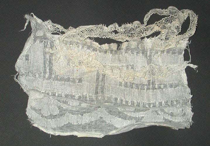 De forme rectangulaire, en étamine blanche, brodée de motifs géométriques et décorée de trois rangs de dentelle blanche.Matériaux et techniques