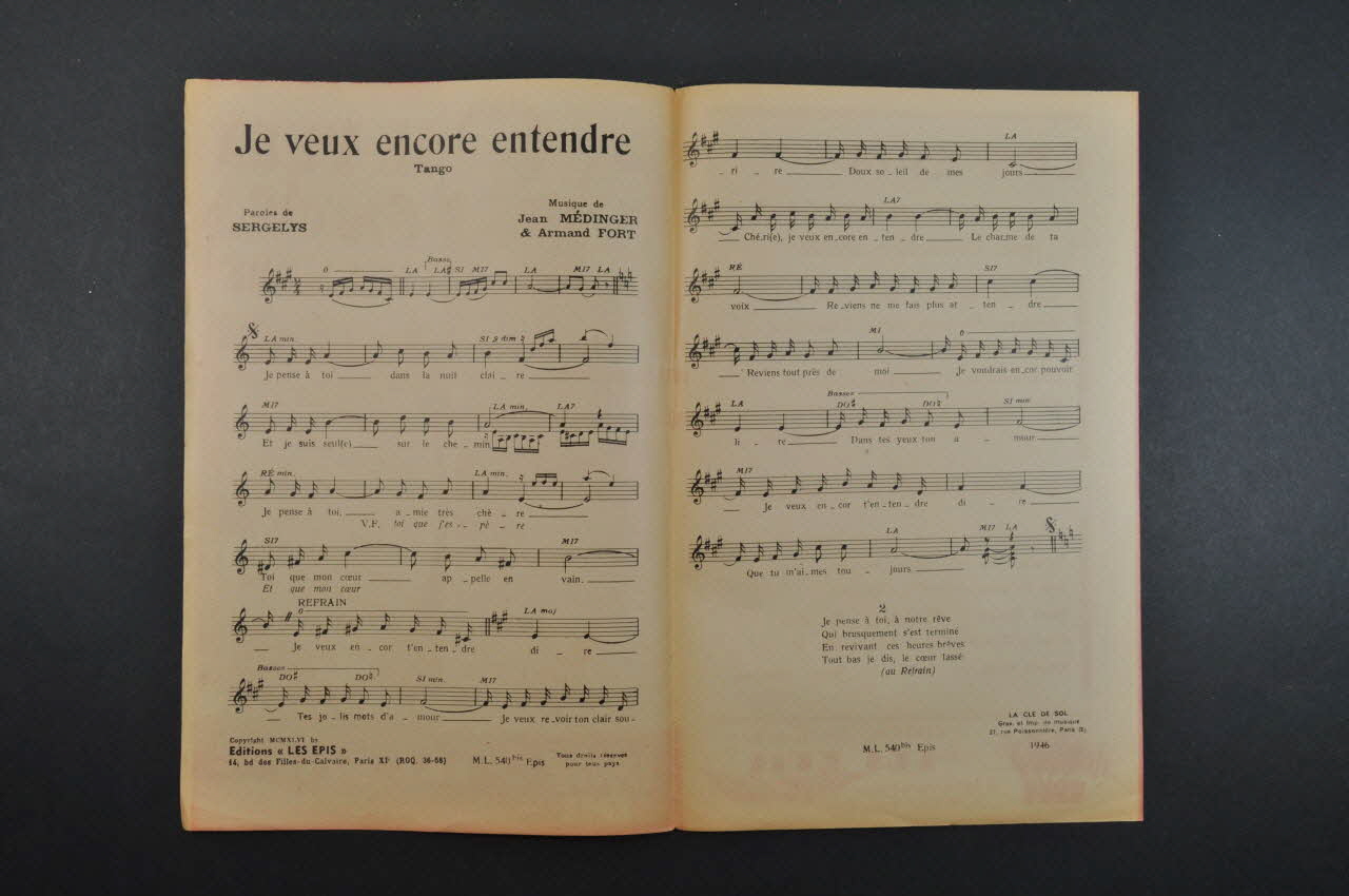 Les inscriptions renseignent le titre de la chanson, le nom des auteurs, de l'artiste et de l'éditeur. A l'intérieur, partitions et paroles de la chanson. Au dos, liste d?autres partitions publiées par l?éditeur.Matériaux et techniques