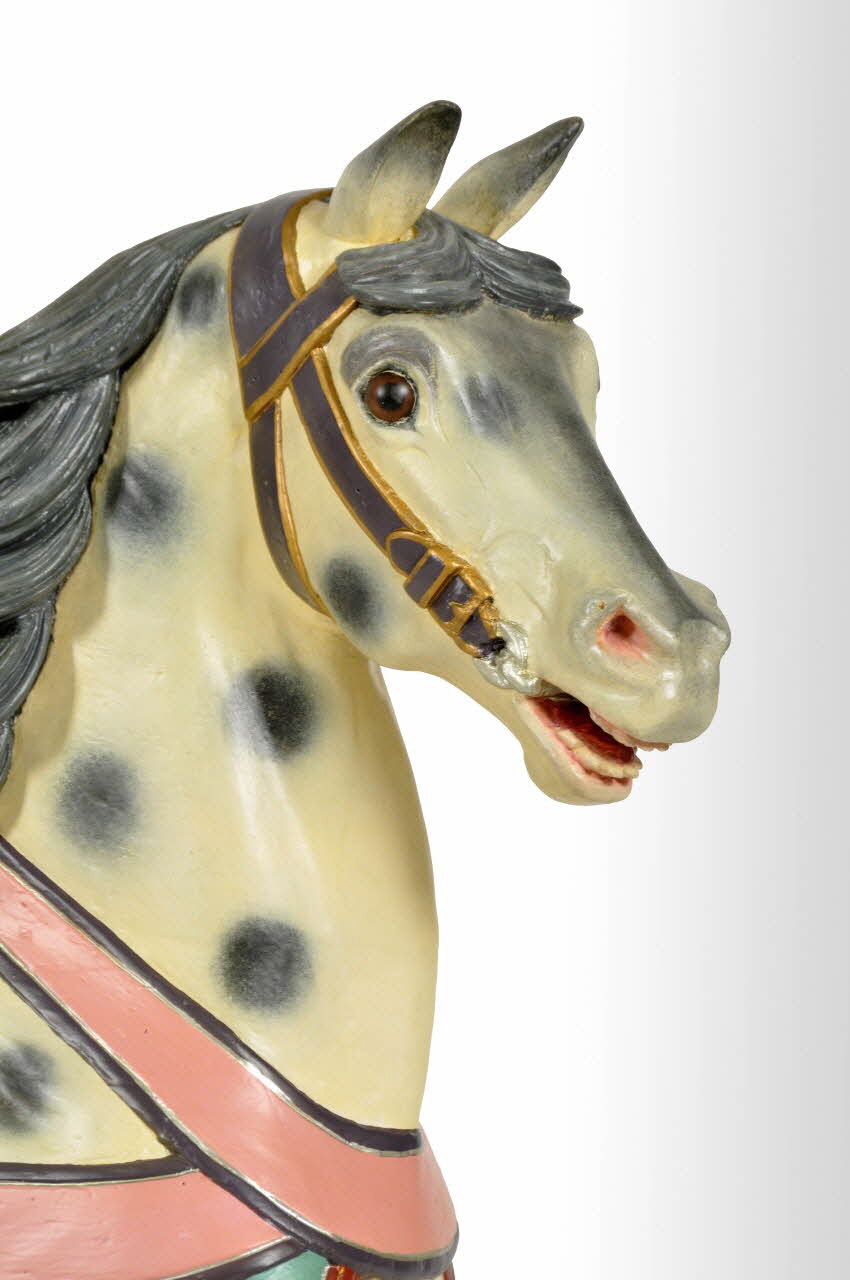Le cheval est orné sur les épaules et les cuisses, d'un collier sculpté en très bas relief, peint en rose à bordure noire présentant sur la partie inférieure des décors en arabesque rouge et verte, avec des gouttes dorées.