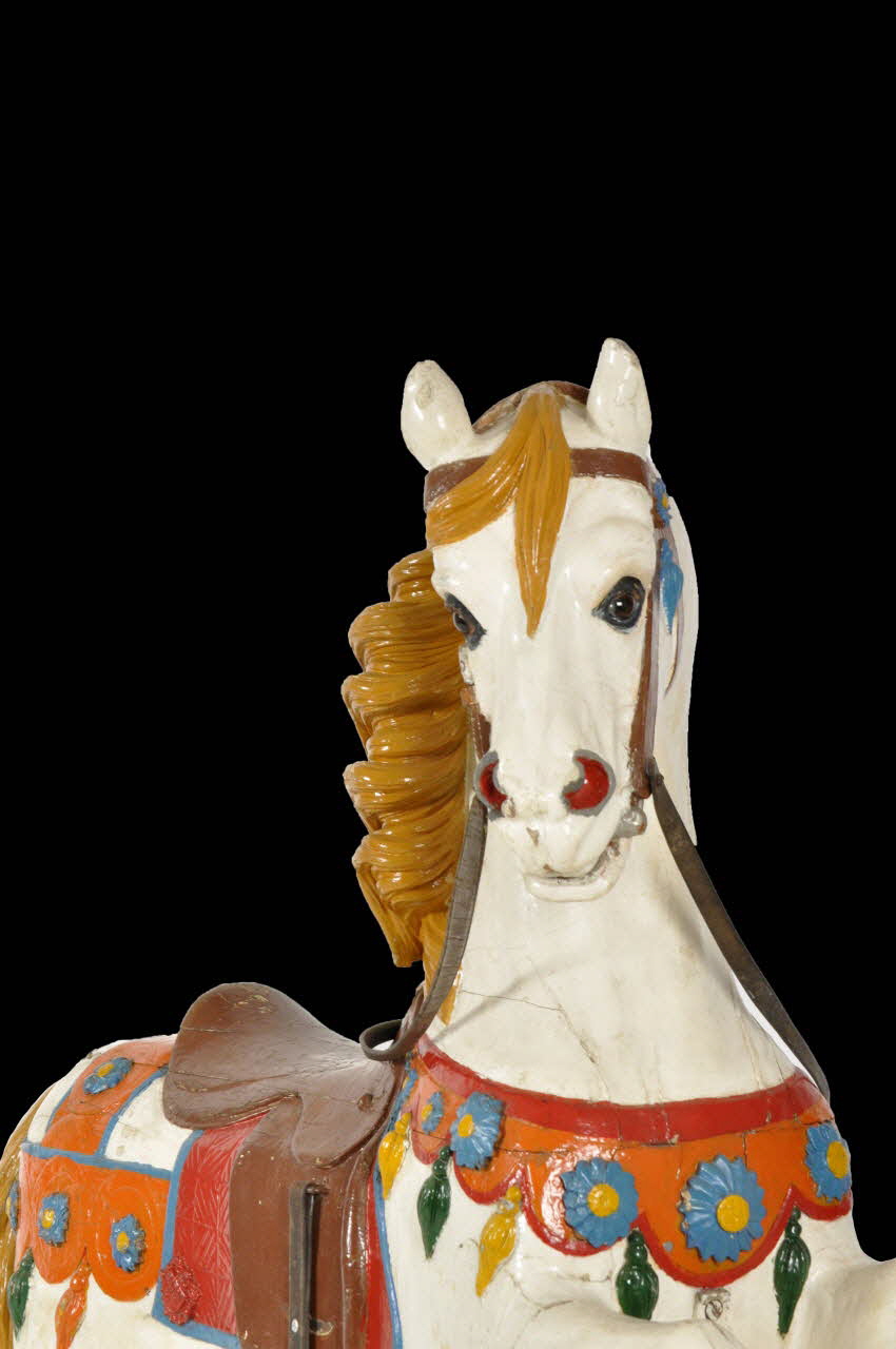 Le collier du cheval est légèrement sculpté sur le bois. Il est peint en orange avec les bordures festonnés peintes en rouge à l'avant. Le collier est orné d'appliques de formes florales jaunes et bleues ainsi que de pompons verts et oranges en bas relief.
