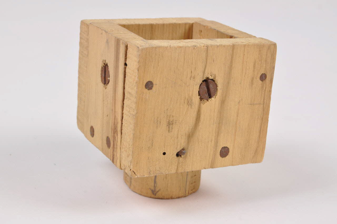 Cube en bois creux, fermé sur cinq faces, présentant un cylindre sur le dessous. Des clous métalliques sont fixés sur les faces.Matériaux et techniques