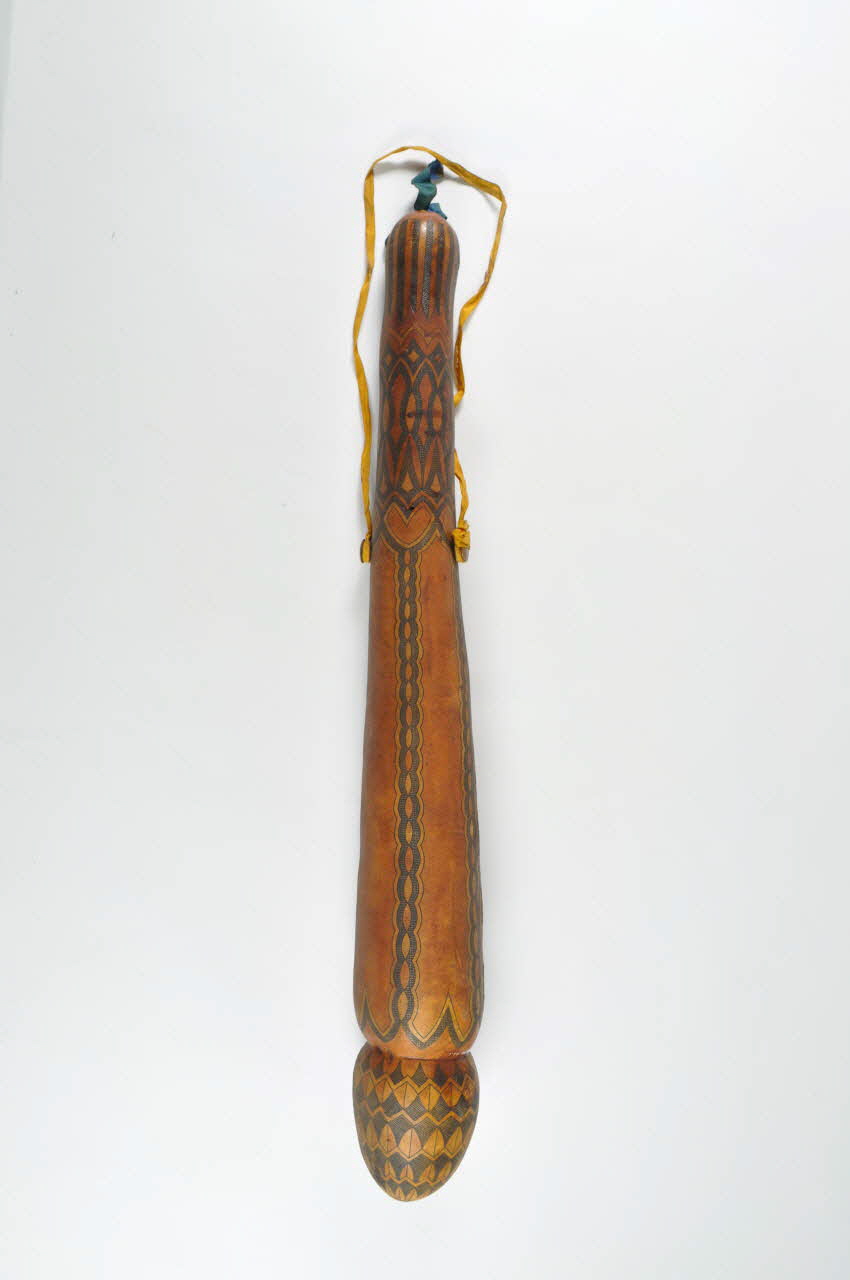 Courge de forme phallique, teintée en rouge à l'eau forte de graveur. Elle est décorée de motifs géométriques et de scènes gravées et teintées à l'encre de Chine noire. Elle est percée d'un trou à l'extrémité, fermé par un bouchon en liège taillé, décoré d'un ruban en tissu synthétique bleu. Deux boutons de bois tourné sont fixés vers une extrémité. Un ruban en tissu synthétique jaune est noué à ces derniers pour servir de bandoulière. Présence de graines à l'intérieur.