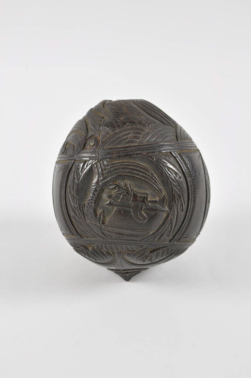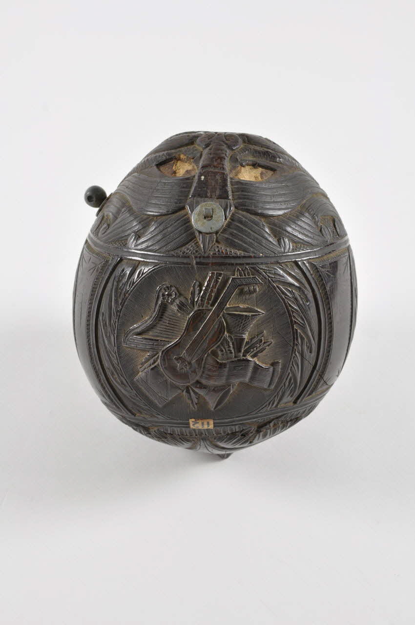 Noix de coco gravée, évidée, sculptée bas-relief. / Objet noir de forme ovoïde évidé. Au sommet de la noix, décor d'une bande d'arcs-de-cercles hachurés ; en-dessous, trois représentations séparées par des rectangles incurvés posés verticalement : des instruments de musique, des armes et enfin le tombeau de Napoléon avec la lettre n et le bicorne et du laurier sur le dessus. Un arbre au ramage tombant se dresse à côté, peut-être le saule pleureur qui se trouvait à côté de la tombe de Napoléon à Sainte-Hélène.