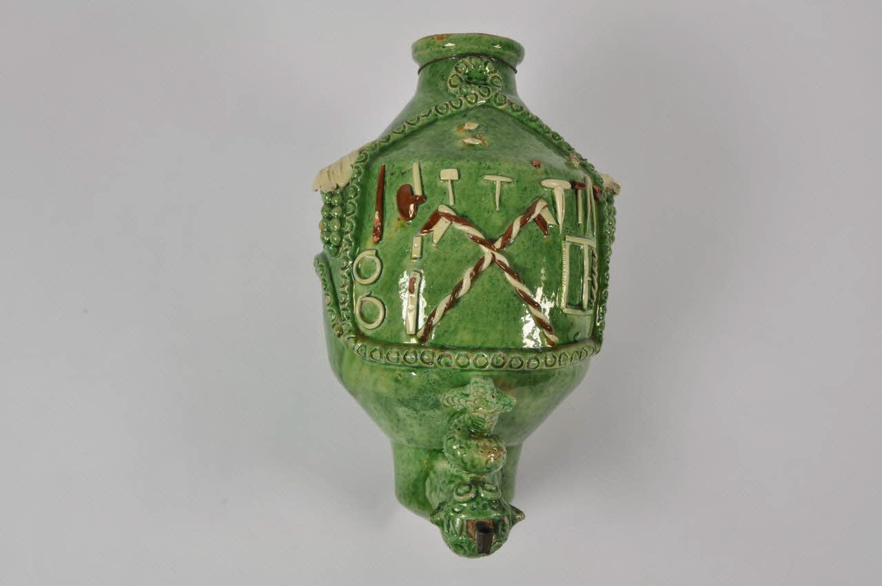 Décor en bandes de terre appliquées en relief . Sur la face antérieure une bande pastillée avec deux grappes de raisin de chaque côté, et au milieu un encadré comportant divers instruments (émaillés brun et crème: scie, compas, maillet, doloire, hache, rabot... avec au centre deux tiges croisées et torsadées surmontées de deux rameaux).