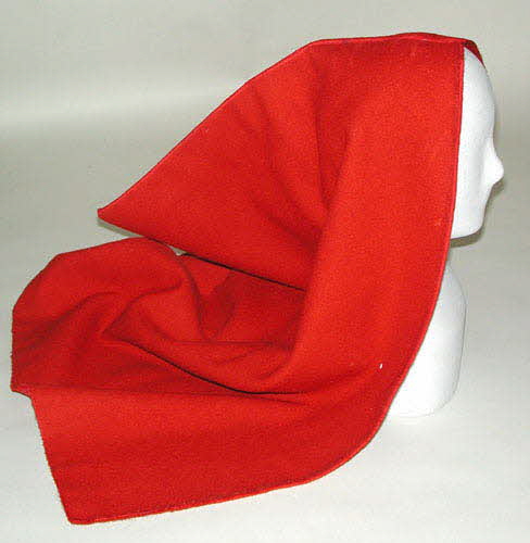 Capuchon rouge en drap de laine bordé d'un ruban en satin rouge brillant ; pièce rectangulaire pliée en deux et cousue en partie supérieure pour former la capuche.Matériaux et techniques