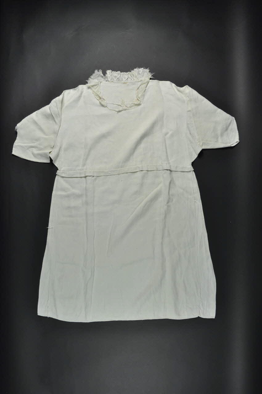 Toile de lin, à col en dentelle exécutée au crochet. / Dessous long en toile de lin et évasé en bas.Encolure ronde décoré en dentelle au crochet.