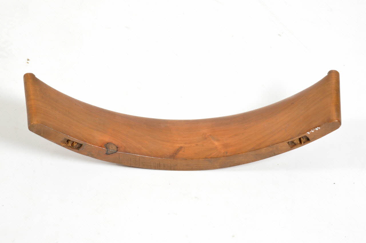 Bois fruitier taillé, tourné, cintré, ciré, teint ; paille de céréales ; à tenon-mortaise / En bois fruitier, avec un dossier à traverse supérieure incurvée et débordante. Deux montants légèrement obliques, reliés par une traverse horizontale également incurvée. Siège garni de paille formant quatre triangles. Quatre pieds droits à section quadrangulaire réunis par six barreaux cylindriques et une traverse plate relie les pieds antérieurs.Matériaux et techniques