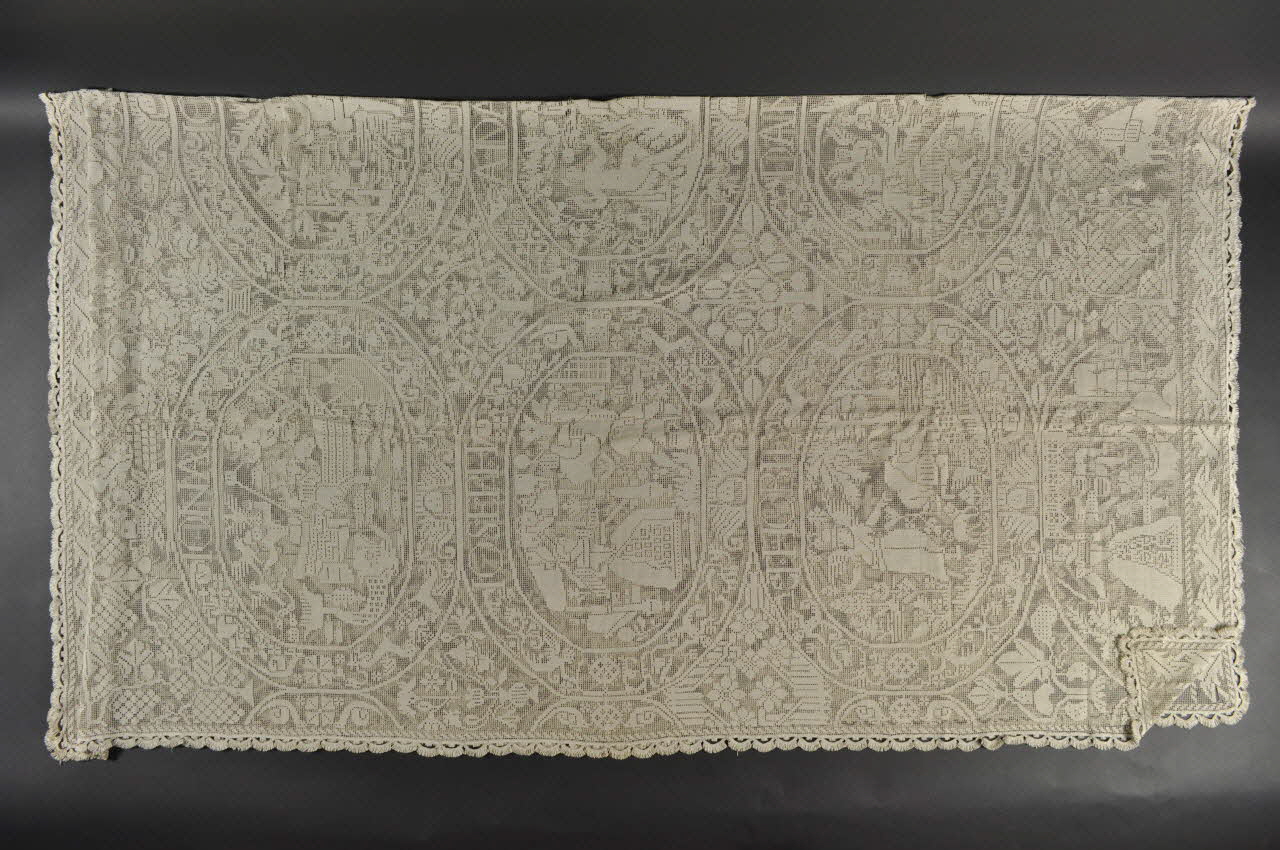 filet noué rebrodé de motifs. / Grand rectangle de filet de coton gris brodé ; au centre, des médaillons présentent des scènes religieuses : Jonas et la baleine - Job - Elisabeth / Joseph - Adam et Eve - Abraham / Thobie et l'Ange - Daniel. Dans le bas à droite figure un blason encadré par deux animaux fantastiques. Le dessus de lit est bordé de frises florales.Décor