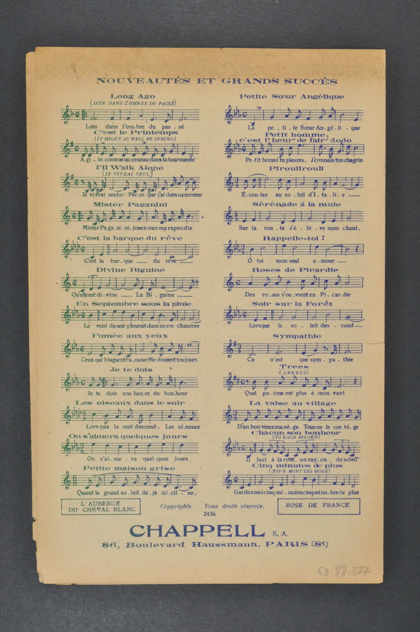 Des inscriptions renseignent le titre, les auteurs, les exécutants et l'éditeur. A l'intérieur, partition et paroles de la chanson. Au dos, liste d'autres partitions publiées par l'éditeur.Matériaux et techniques