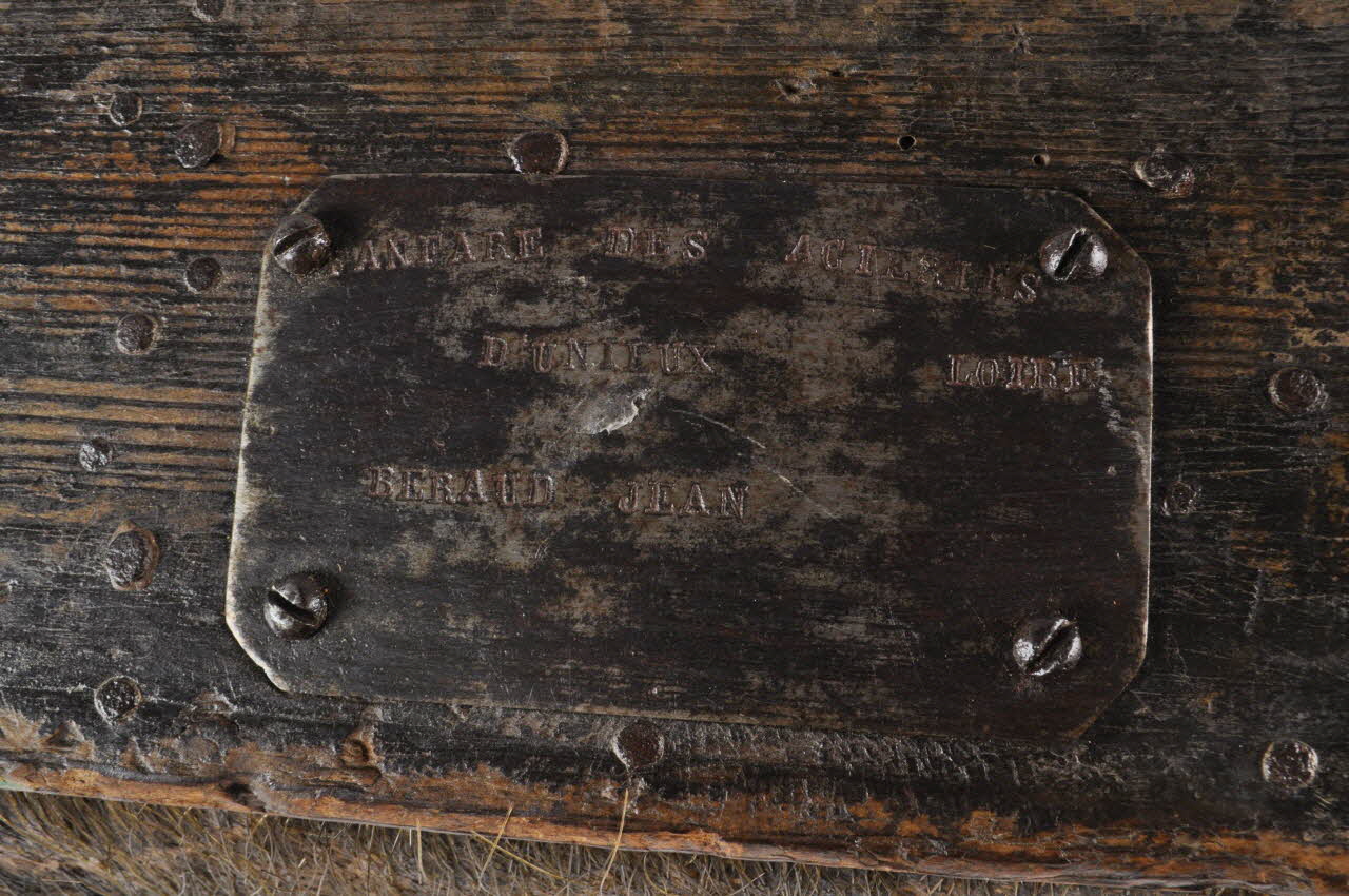 Longue malle rectangulaire, constituée de lattes de bois. Des traverses de bois sont clouées horizontalement sur les grands côtés, tandis que des montants en fer forgé sont rivetés verticalement sur les faces. D'autres montants métalliques viennent renforcer les arêtes de la malle.
