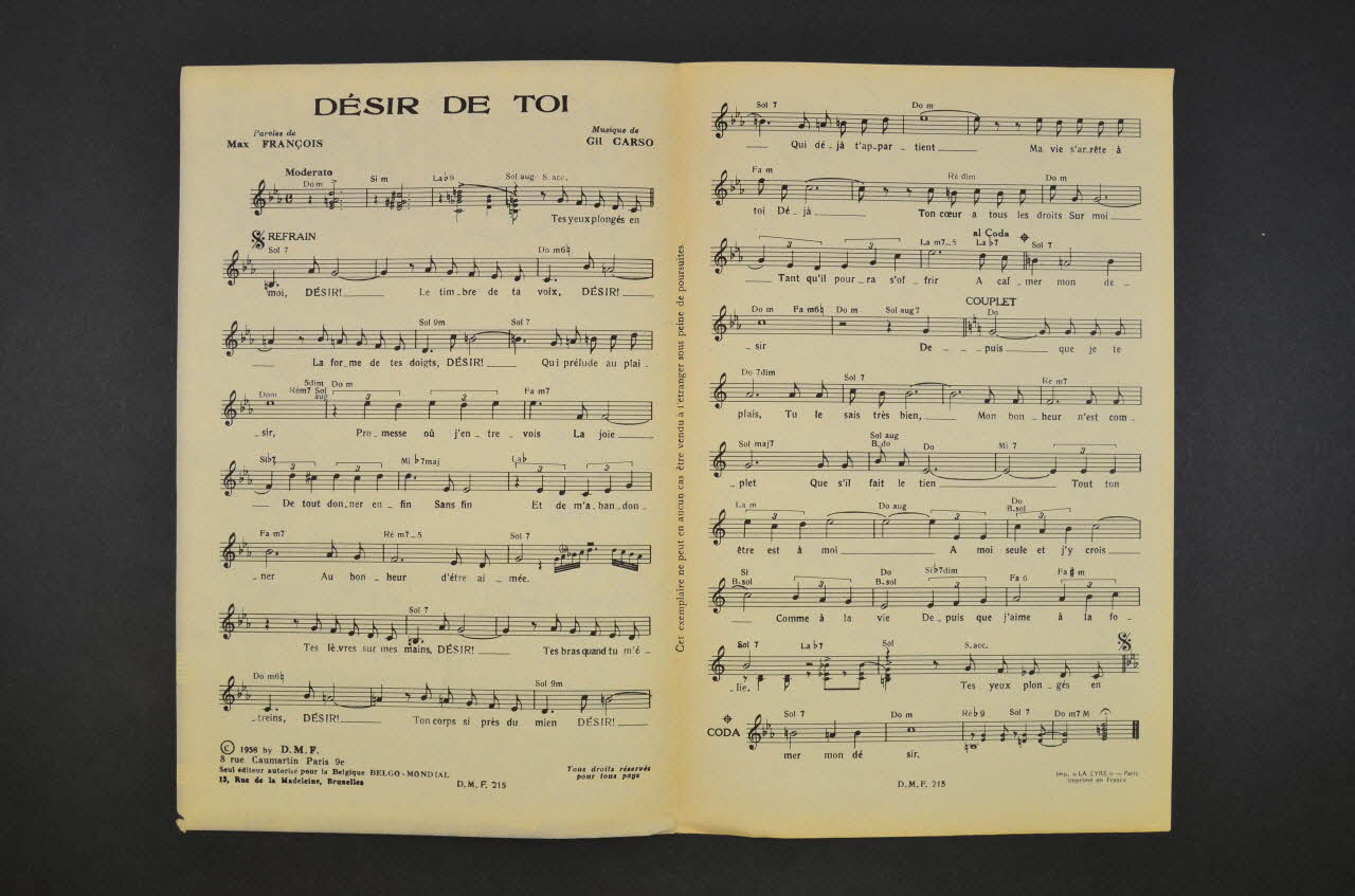 Les inscriptions renseignent le titre de la chanson, le nom des auteurs, de l'artiste et de l'éditeur. A l'intérieur, partitions et paroles de la chanson. Au dos, un tableau pratique pour apprendre la guitare.Matériaux et techniques