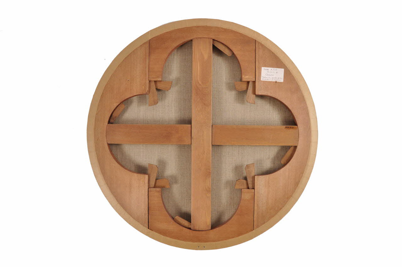 Huile sur toile de forme circulaire fixé par des semences sur un châssis à clés chanfreiné en bois.