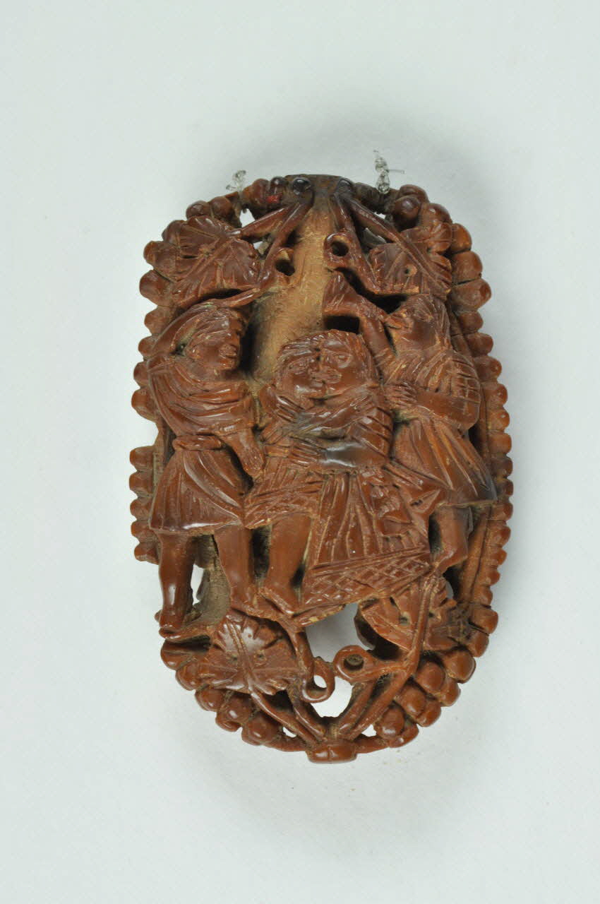 Noyau-de-pêche sculpté et ajouré / Noyau à décor de perles continues, de quatre personnages sur chaque face, encadrés de feuilles de vignes et de grappes de raisins. Sur une face : deux personnages agenouillés, et deux debouts, (adoration des mages?), sur l'autre face : deux soldats, l'un avec une trompette, l'autre avec un fouet, encadrent deux personnes embrassées, (baiser de Judas?).Décor