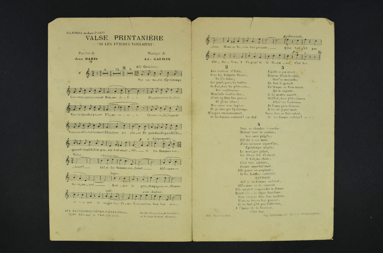 Les inscriptions renseignent le titre de la chanson, le nom des auteurs, de l'artiste et de l'éditeur. A l'intérieur, la partition et les paroles de la chanson. Au dos, une liste des titres diponibles chez le même éditeur.Matériaux et techniques
