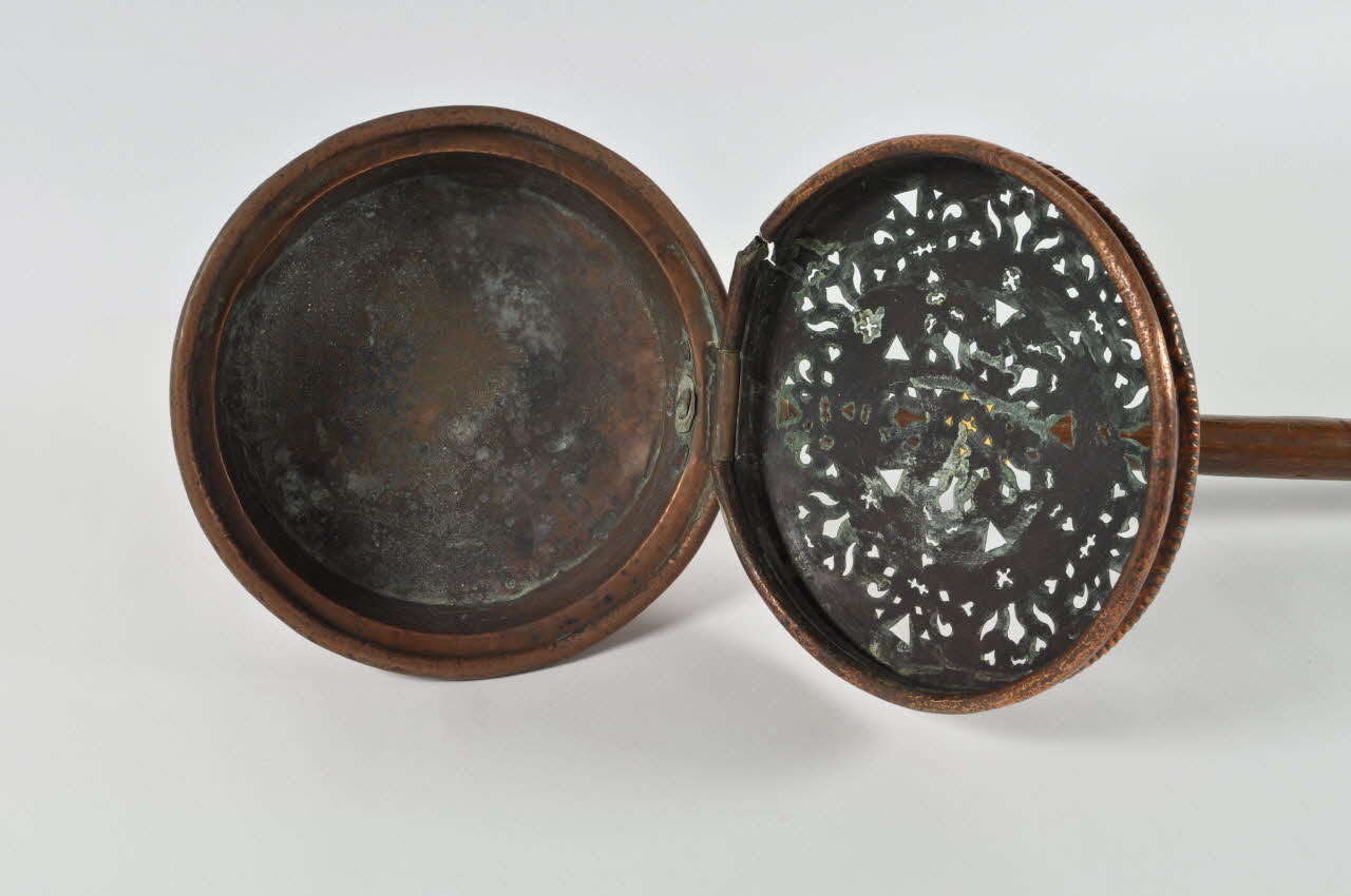 Cuivre rouge, battu à couvercle ajouré-emporte-pièce, mouluré, à charnière à gond ; à partie en cuivre jaune battu découpé cloué ; à clous en fer ; à manche en bois feuillu-indigène découpé-taillé verni forcé, riveté / Objet à plan circulaire à fond bombé ayant des bords bas, des lèvres rondes et possédant un couvercle mobile. Son décor représente une rosace centrale formée de points alignés, entourée d'une ligne ondulée en pointillé; à points, à triangle, à coeur, à moulures, à quatre feuilles, à delta, à virgules, à flammes, à lentilles, à soufflet, à diabolos, ajourés. Une partie cylindrique creuse accueille un long manche latéral en bois ayant un trou à l'extrémité et une ficelle nouée.