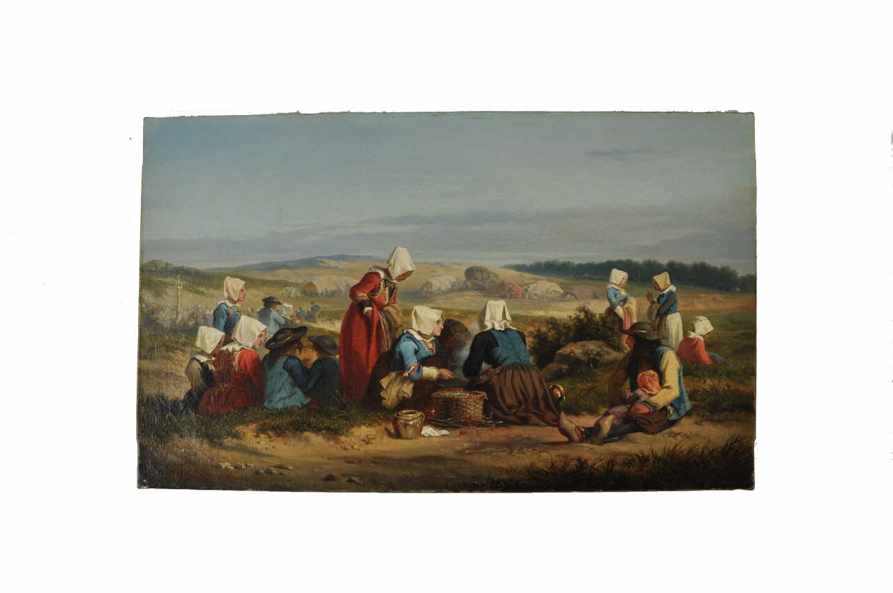 C'est la scène de retour du pardon. Au premier plan, au centre, trois femmes et un homme sont en train de faire cuire un repas dans un panier en vannerie en se servant également des pots en grès.