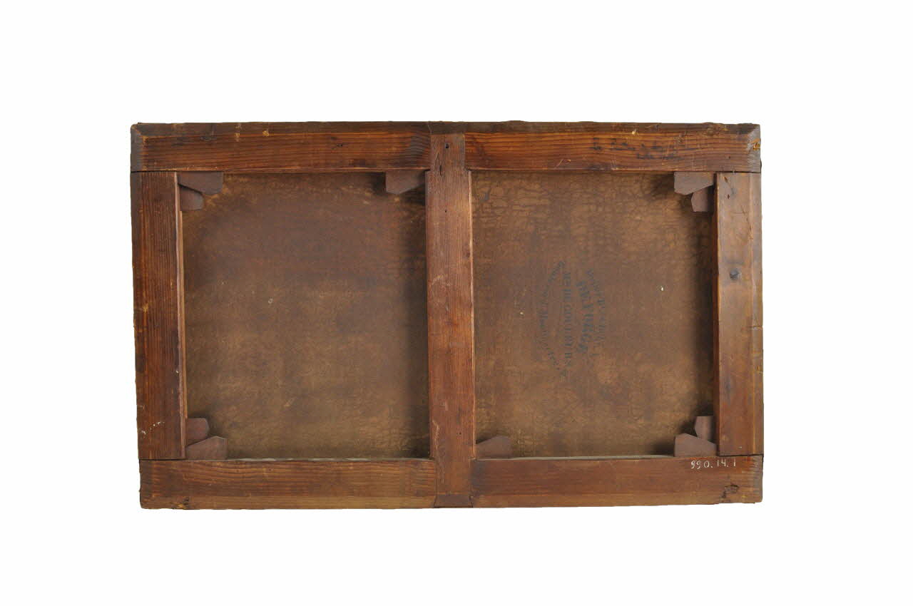 Huile sur toile de forme rectangulaire fixé par des semences sur un châssis à clés chanfreiné en bois.