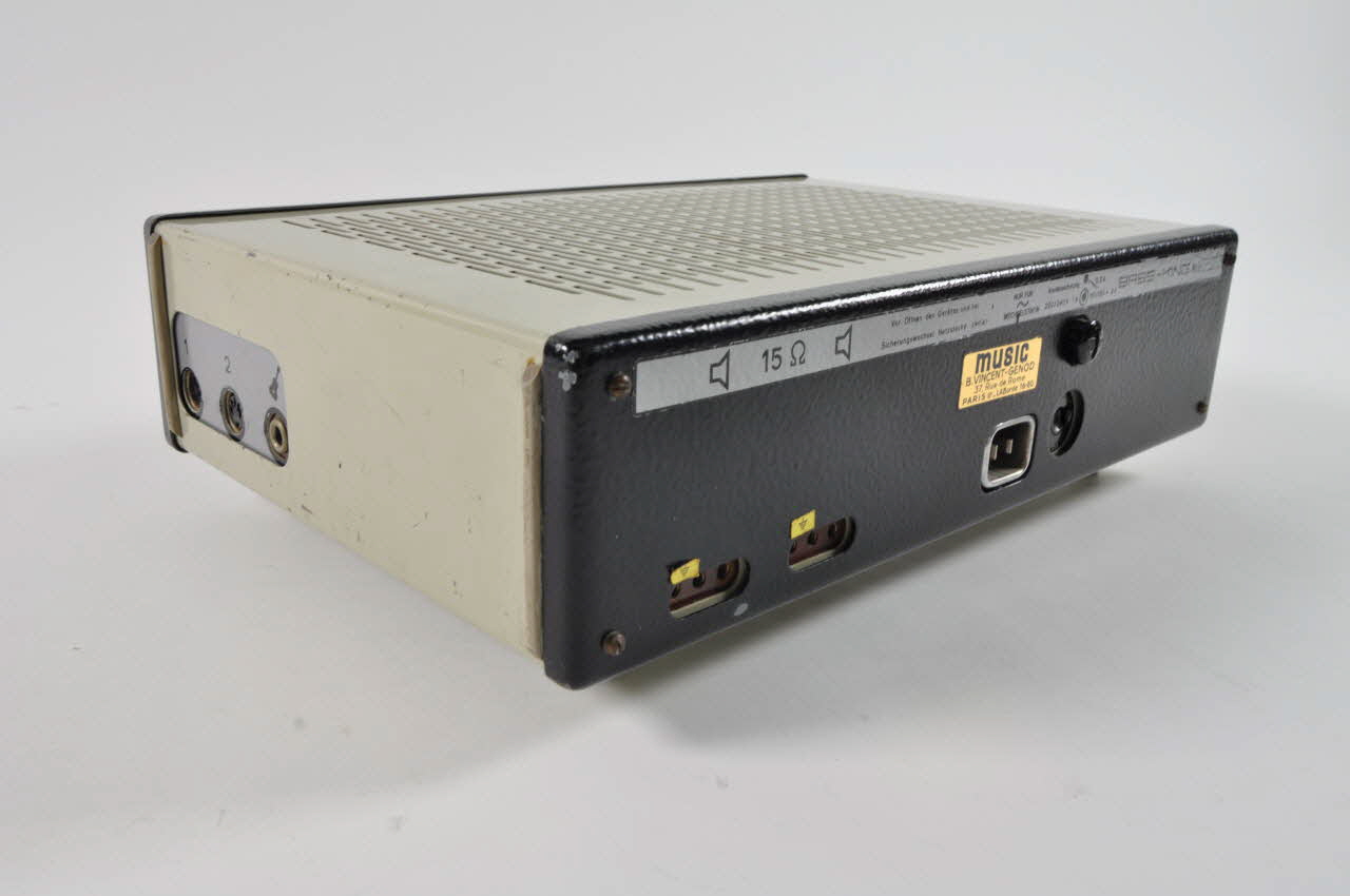 Sur le côté droit : deux sorties Din en plastique pour micro/chant ou magnétophone et une entrée jack symbolisée par le dessin d'une guitare.