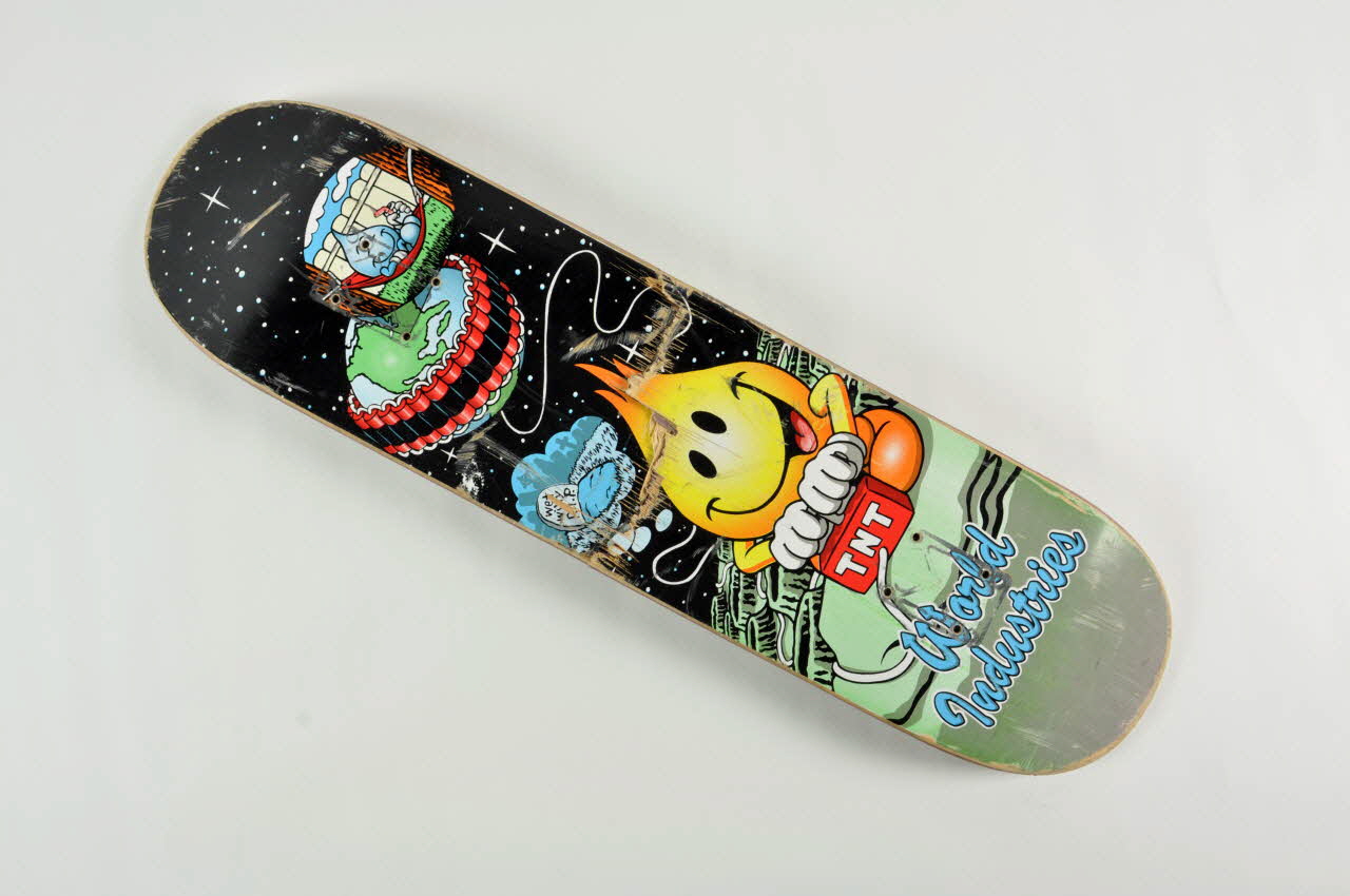 Le film déco en dessous représente un petit personnage en forme de flame jaune actionnant un levier relé à une bande dynamite ceinturant la Terre. En dessous du personnage, le logo "World Industries" Planche cassée au centre, exemple de cassure typique en usage de saut de marches. Planche étroite. Retour au distributeur pour défauts.Décor