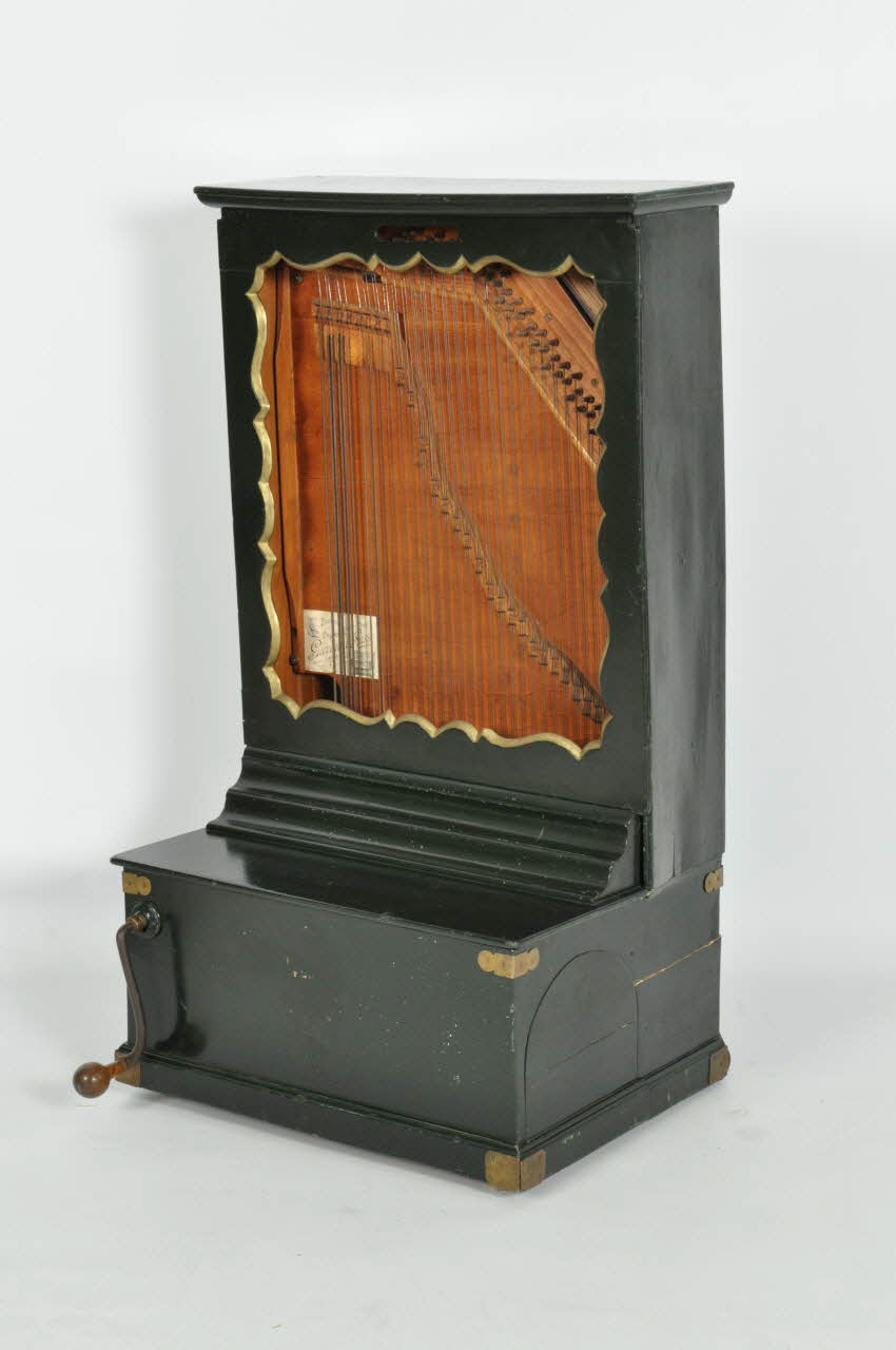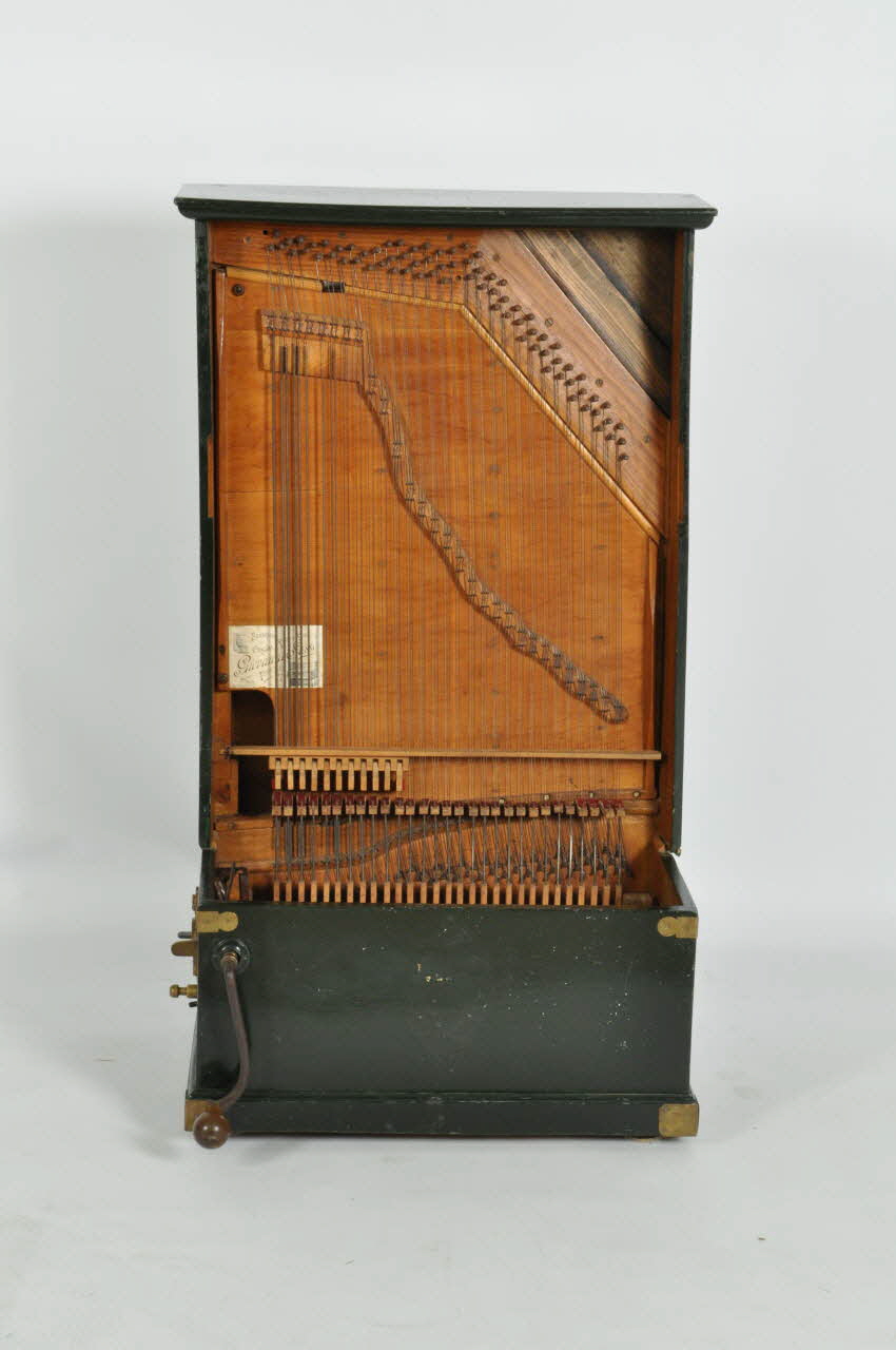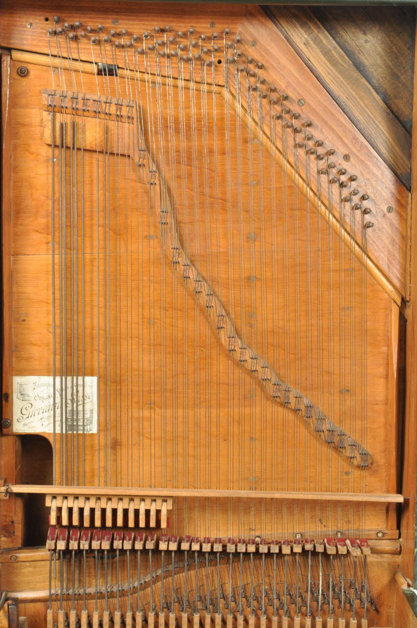 A l'intérieur, structure verticale en sapin formant la caisse de raisonnance avec 75 chevilles sur lesquelles sont tendues des cordes décroissantes de gauche à droite de la plus épaisse et plus longue à la plus petite et plus fine.