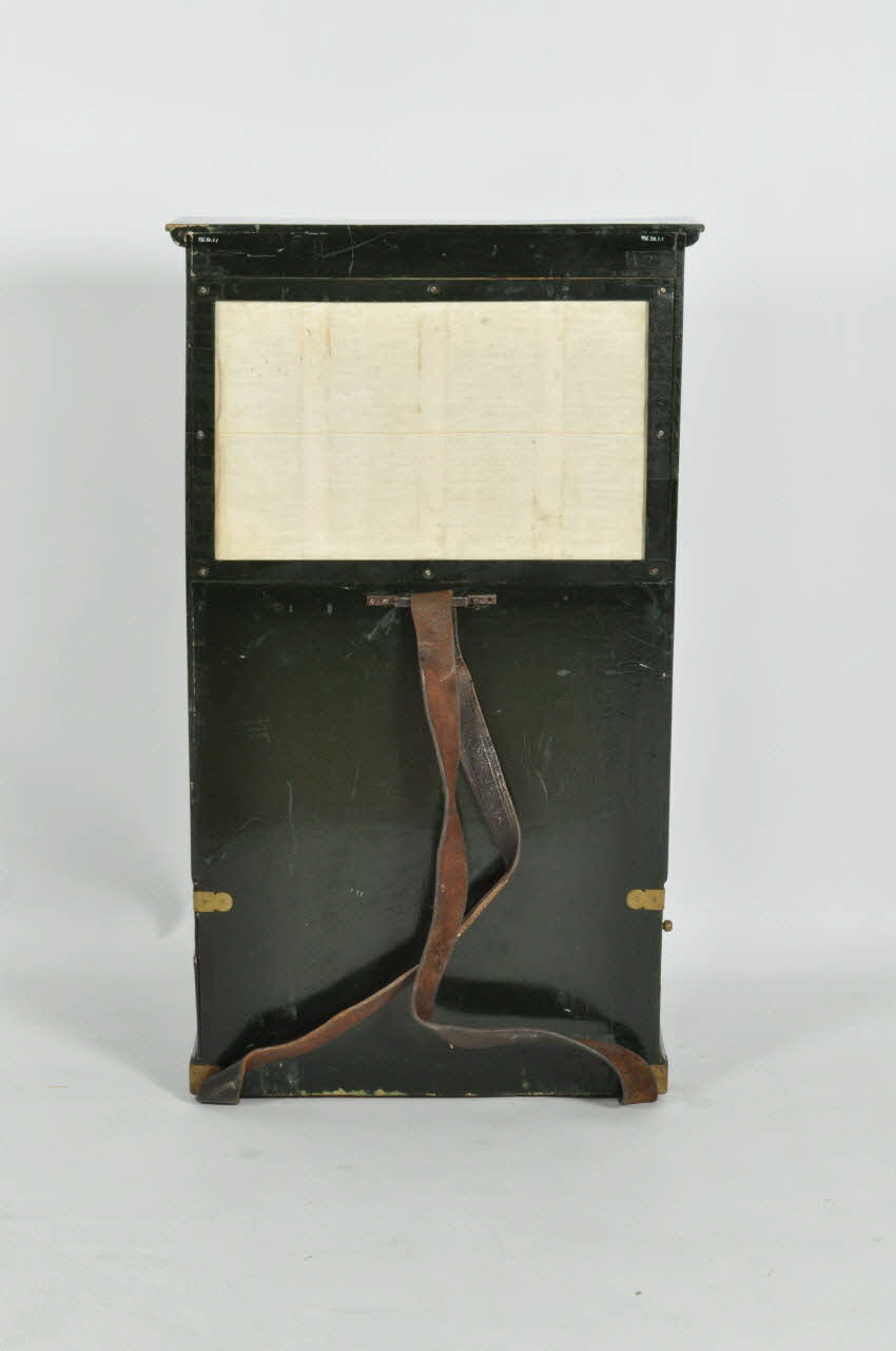 Petite corniche moulurée saillante sur trois côtés, cadre champtourné à bords biseautés peints en dorés, muni d'une petite poignée en partie supérieure et s'emboitant par un système de rainures et languettes dans la moulure du couvercle du caisson. Un pièce de toile rouge venait à l'origine fermé l'ouverture.