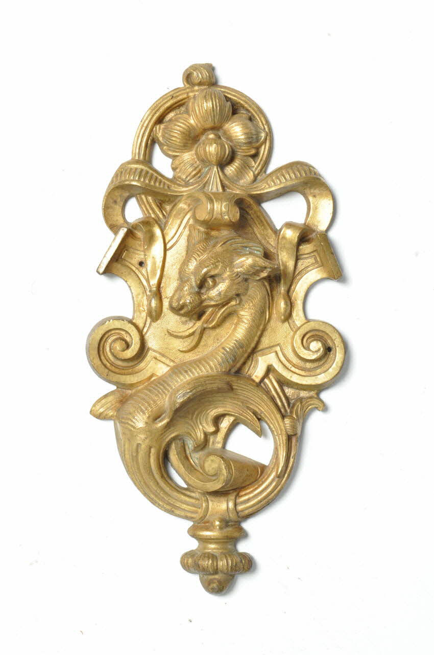 Au centre, décor en laiton moulé, emboité sur un petit pic lacunaire représentant un motif de cuir découpé, rubans et palmettes, surmontés d'une fleur et ornée d'un motif de dragon stylisé enroulé.