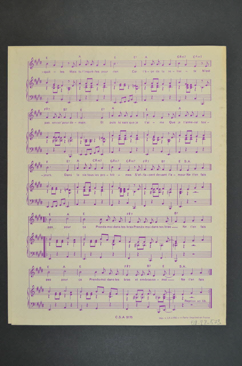 Sur la couverture, le portrait photographique de Dalida sur un fond pied-de-poule. Les inscriptions renseignent le titre de la chanson, le nom des auteurs, de l'artiste et de l'éditeur. A l'intérieur et au dos, partition et paroles de la chanson.Matériaux et techniques
