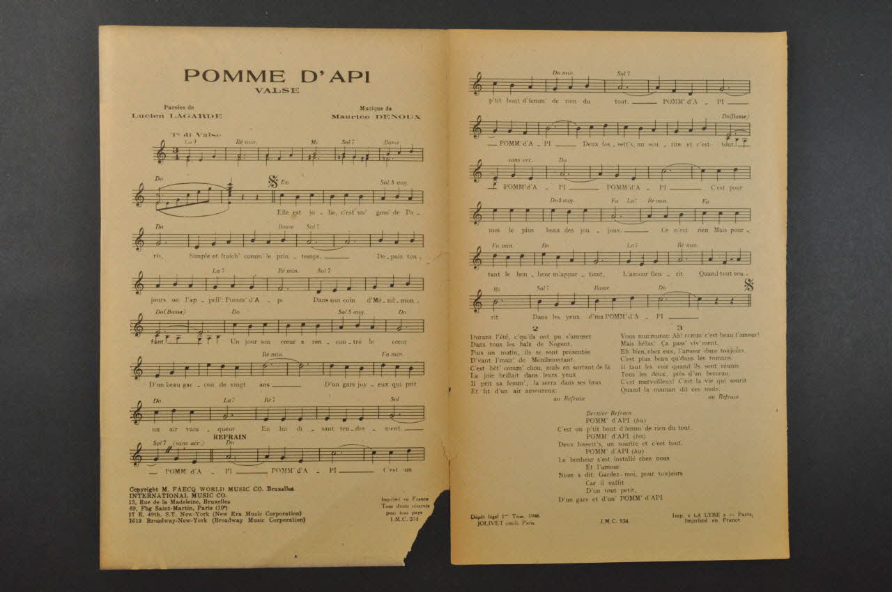 Des inscriptions renseignent le titre, les auteurs, les exécutants et l'éditeur. A l'intérieur, partition et paroles de la chanson. Au dos, liste d'autres partitions publiées par l'éditeur.Matériaux et techniques