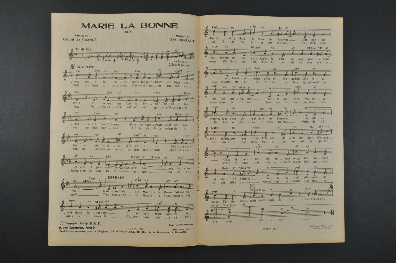 Les inscriptions renseignent le titre de la chanson, le nom des auteurs, de l'artiste et de l'éditeur. A l'intérieur, la partition et les paroles de la chanson. Au dos, un tableau pratique pour apprendre la guitare.Matériaux et techniques