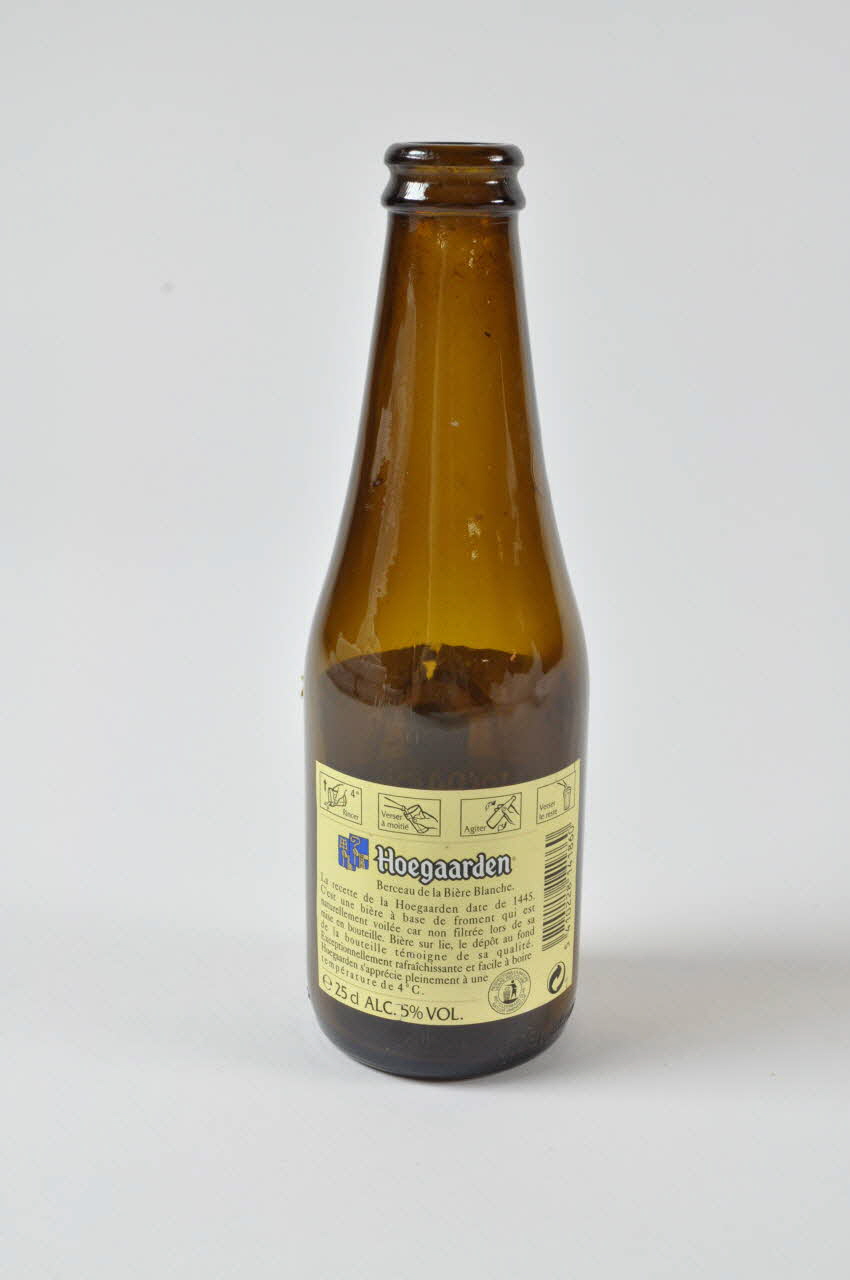 4° / Rincer / Verser à moitié / Agiter / Verser le reste / Hoegaarden / Berceau de la Bière Blanche. / La recette de la Hoegaarden date de 1445. / C'est une ière à base de froment qui est / naturellement voilée car non filtrée lors de sa / mise en bouteille. Bière sur lie, le dépôt au fond / de la bouteille témoigne de sa qualité. / Exceptionnellement rafraîchissante et facile à boire / Hoegaarden s'apprécie pleinement à une / température de 4°C. / e 25 cl ALC. 5% VOL. / RESPECTONS LA NATURE / VERRE RECYCLABLE, dosMatériaux et techniques