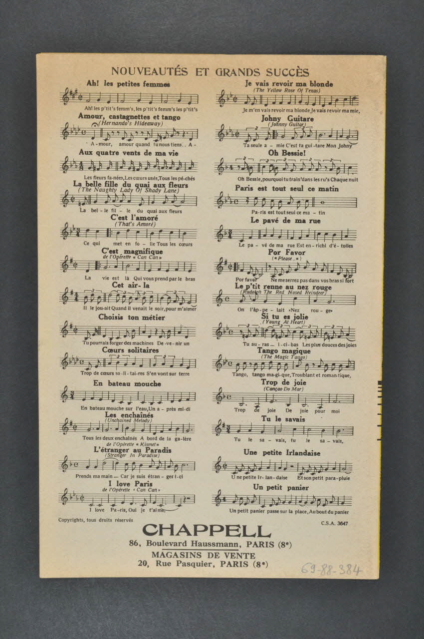 Les inscriptions renseignent le titre de la chanson, le nom des auteurs, de l'artiste et de l'éditeur. A l'intérieur, partitions et paroles de la chanson. Au dos, liste d?autres partitions publiées par l?éditeur.Matériaux et techniques