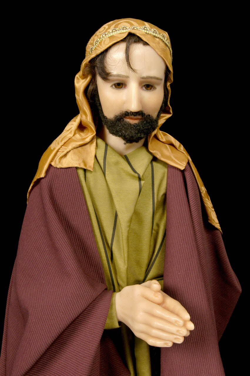 Saint Joseph est agenouillé et prie les mains jointes. Visage, mains et pieds en cire. Cheveux naturels. Le reste du corps est un rembourrage de textiles sur armature métallique fixée sur un socle de bois. Vêtements de textiles jaune, bordeaux et vert.Décor