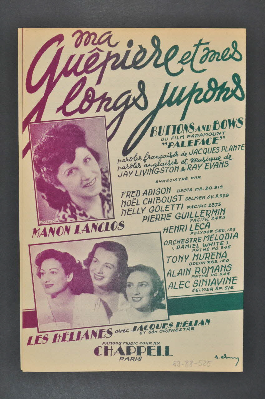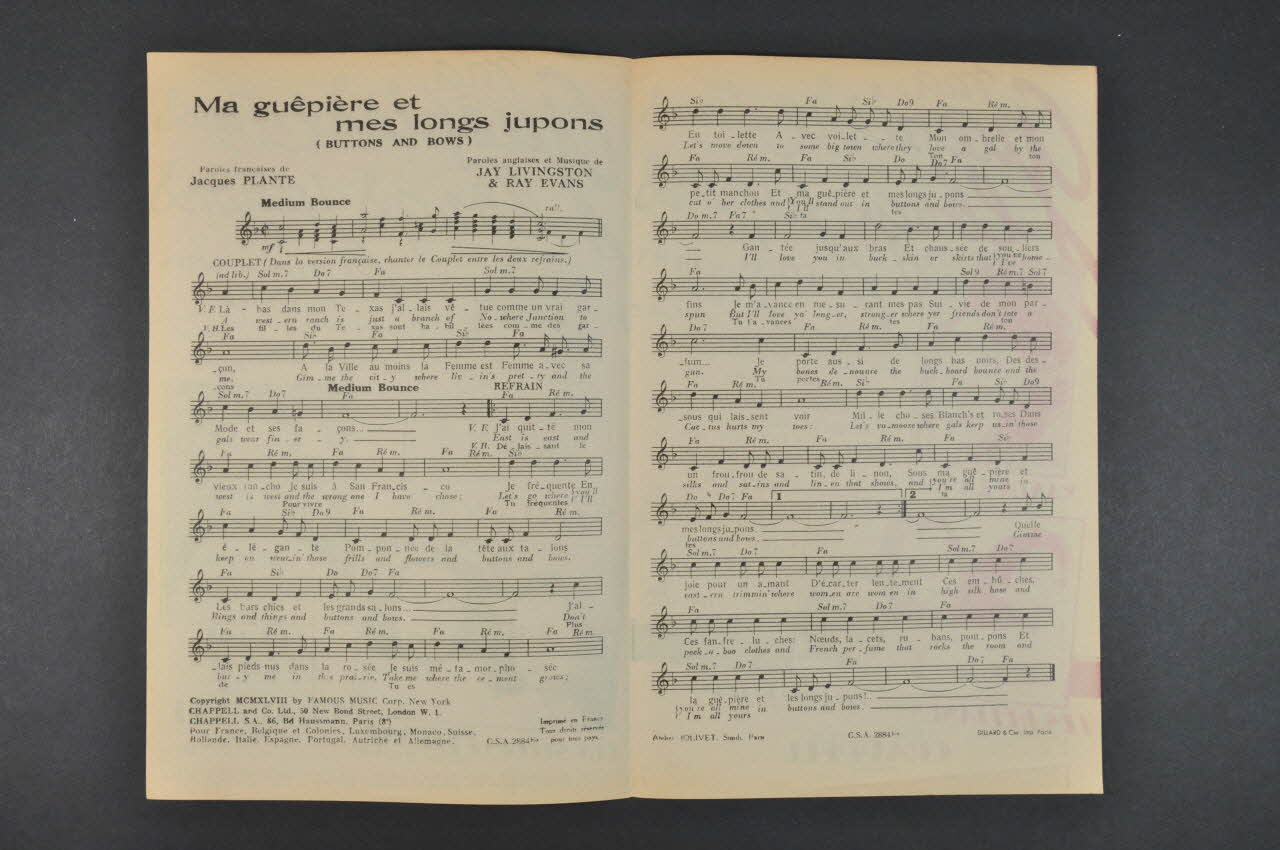 Les inscriptions renseignent le titre de la chanson, le nom des auteurs, de l'artiste et de l'éditeur. A l'intérieur, partitions et paroles de la chanson. Au dos, des photographies d'autres interprètes.Matériaux et techniques