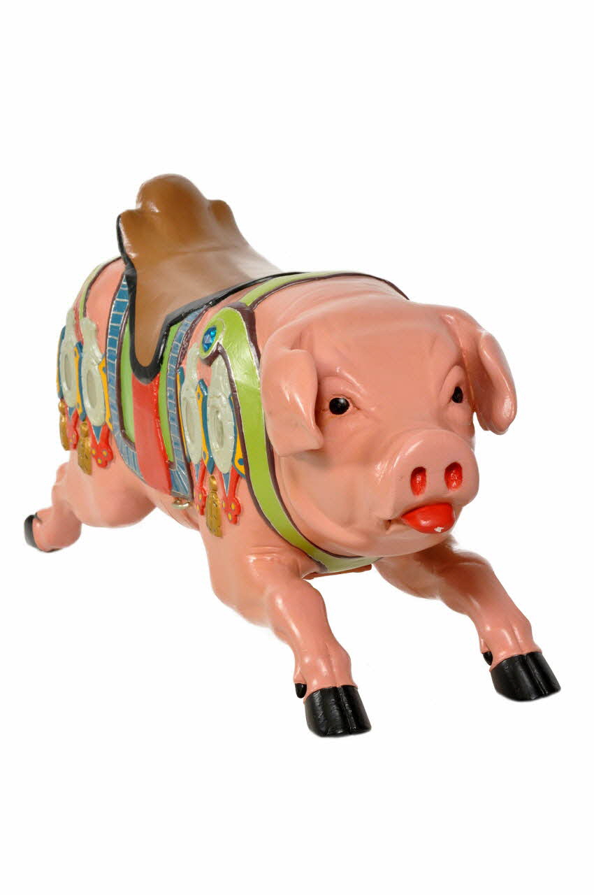 Cochon sauteur à quatre pattes, tirant la langue et présentant une queue en tire-bouchon. Il est sculpté et peint et appartient au Manège de Nogent.