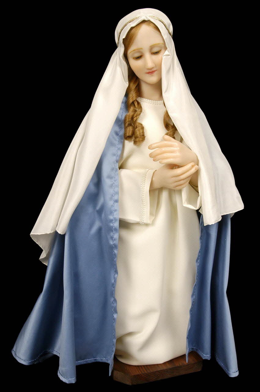 La Vierge est agenouillée et prie. Visage, mains et pieds en cire.Cheveux naturels. Le reste du corps est constitué d'un rembourrage de textiles sur armature métallique fixée sur un socle de bois. Vêtement de textiles bleus et blancs.Décor